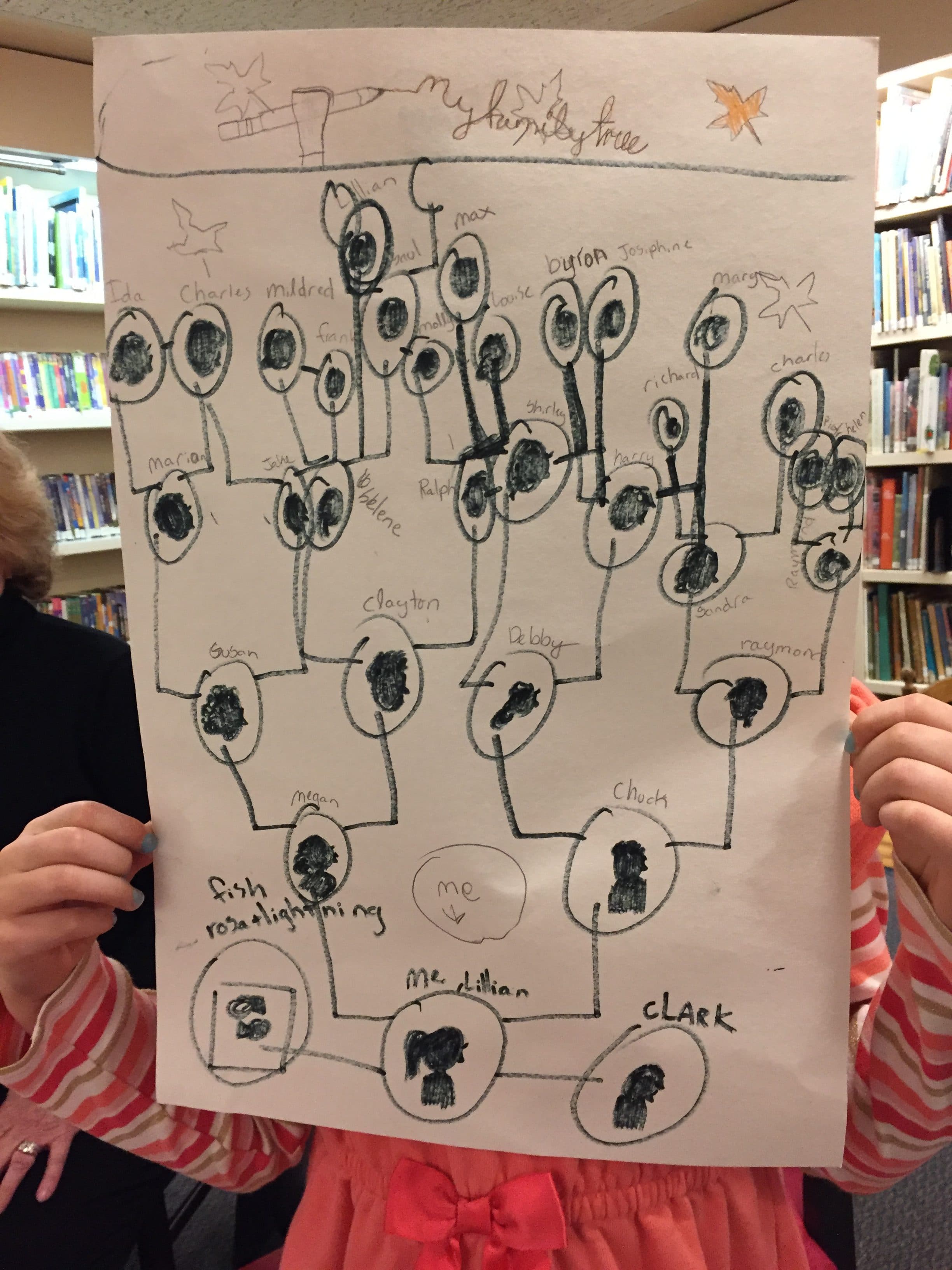 We chatted about genealogy from a kid’s perspective. I showed them historical depictions of families. Paintings that illustrated multiple generations gathered around a table. An eighteenth century family tree with apples representing people and a photo tree.