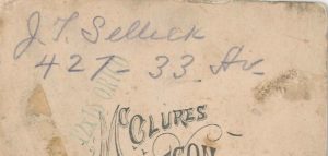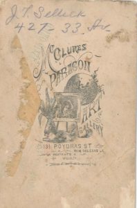 Look closely and you’ll see both a name and address in pencil. Also on the back near the writing is a green stamped “12×16 Orico.” This refers to a size and type of picture. Sometimes studios created product names to differentiate their pictures from their competition. This appears to be the case with the Orico. The 12 x 16 suggests that someone had an oversize copy made of this picture, perhaps even a handcolored one. It’s likely that the customer was J.T. Selleck, possibly the son of the man depicted.