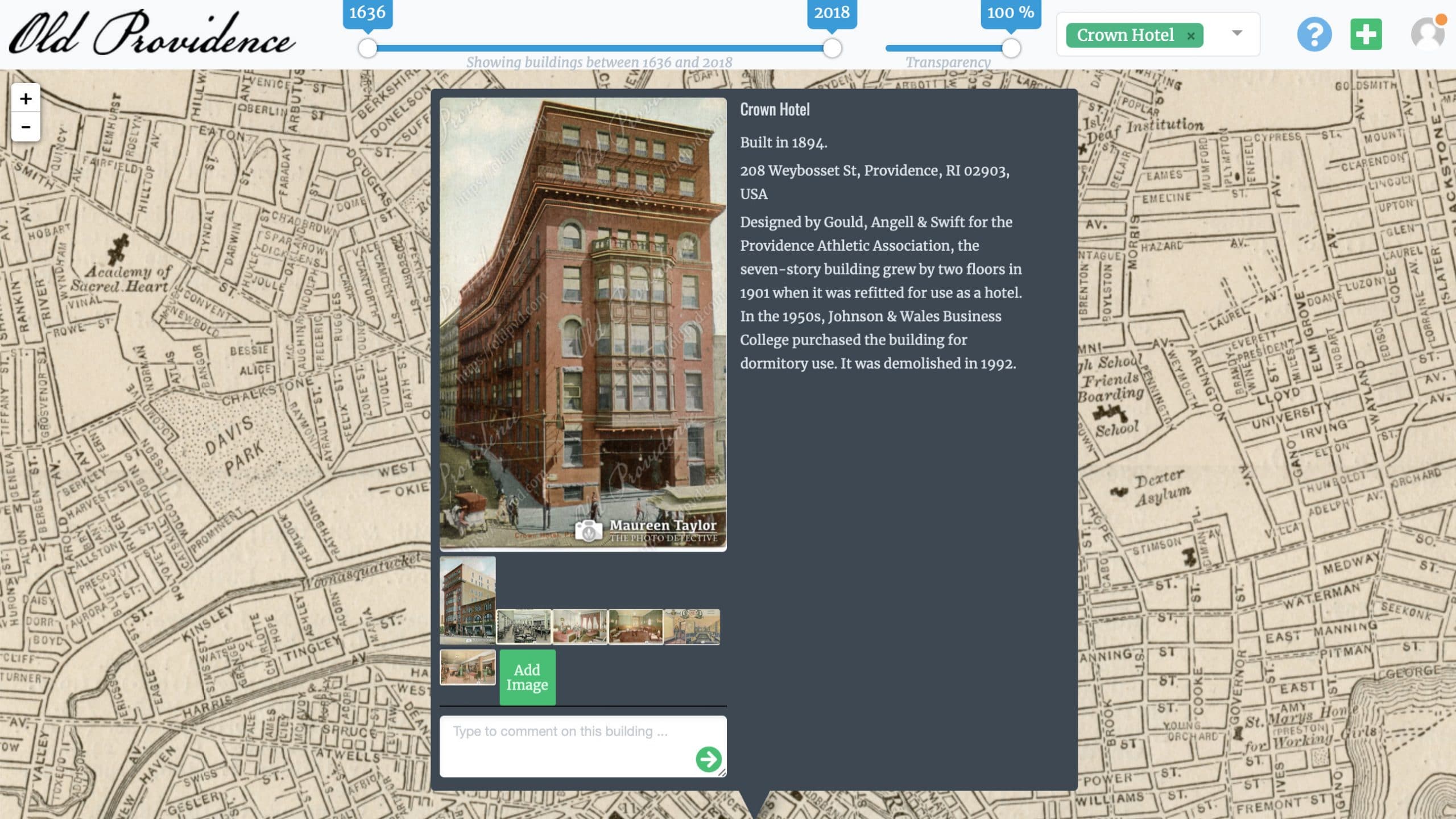 For instance, type “Crown Hotel” in the search box at the top of the screen. You’ll see a single marker. Click that to be taken to a new window where you’ll see a brief historical sketch and be able to explore a series of images of the interior and exterior of the building.